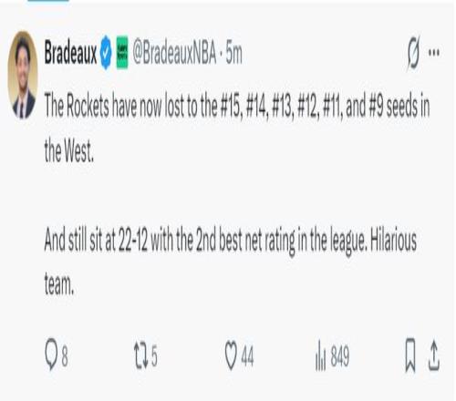 火箭队记Bradeaux写道:火箭队近期接连输给西部排名15、14、13、12、11、9的球队,目前火箭战绩22胜12负,火箭净胜分联盟第二,这真是一支有趣的球队。